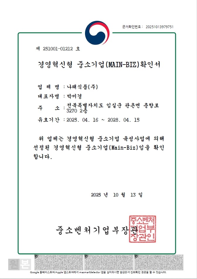 나래식품(주)는 항상 정직한 맛과 믿을 수 있는 최고의 품질을 추구합니다.